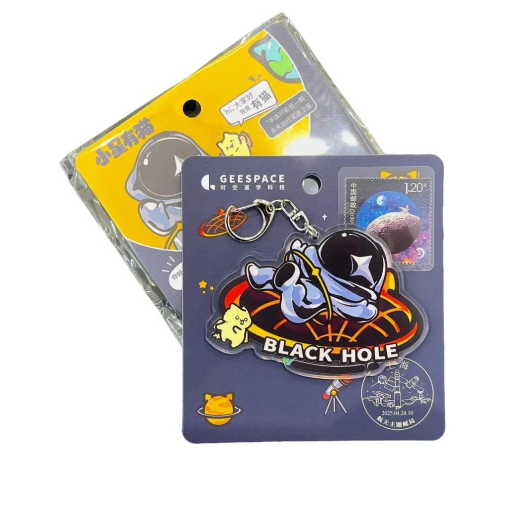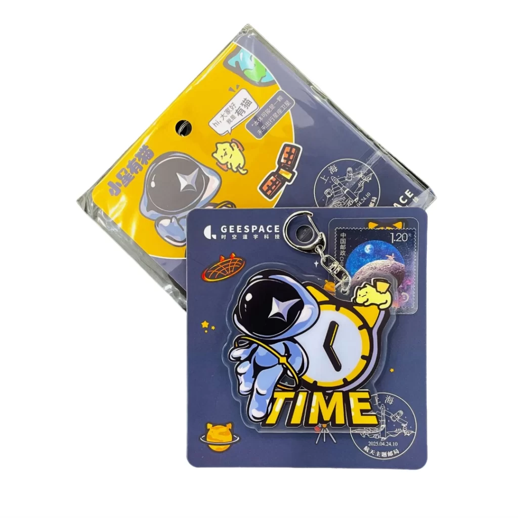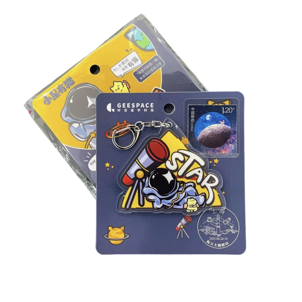 灵感来源于时空道宇原创航天IP小星有猫(STAR FRIENDS)。 小星是神秘的时空探险家,有猫本体是一颗未来出行星座卫星。 本次小星有猫与航天邮局合作,共同推出联名钥匙扣,还附赠登月邮票哦。